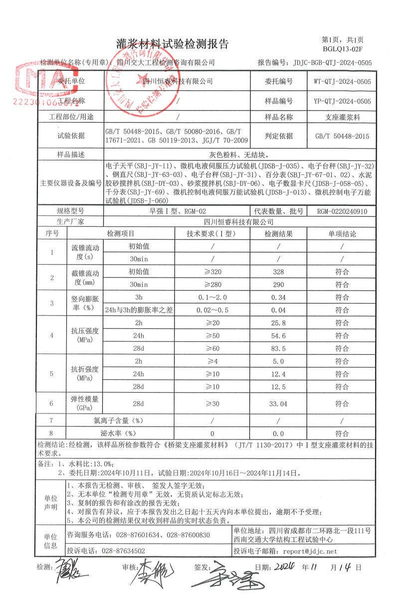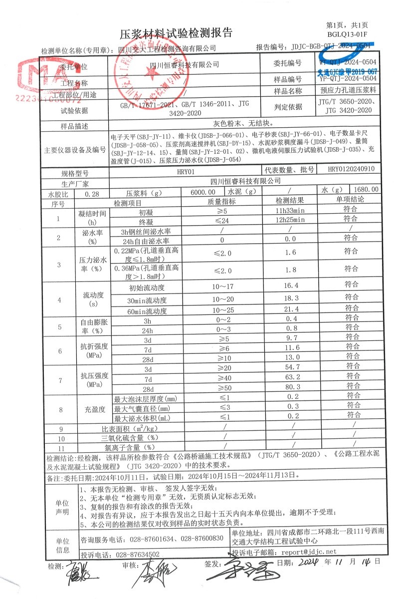 公司主營生產高強度聚合物砂漿,高強無收縮灌漿料,孔道壓漿劑,高鐵加固專用聚合物修補砂漿,橋隧專用電纜,自公司成立以來始終以滿足客戶的需求為焦點,可根據(jù)工程規(guī)范要求生產或提供來料加工等特殊服產品訂制服務,為諸多行業(yè)用戶提供了高質量的系列產品和優(yōu)質服務,得到了用戶的廣泛認可。